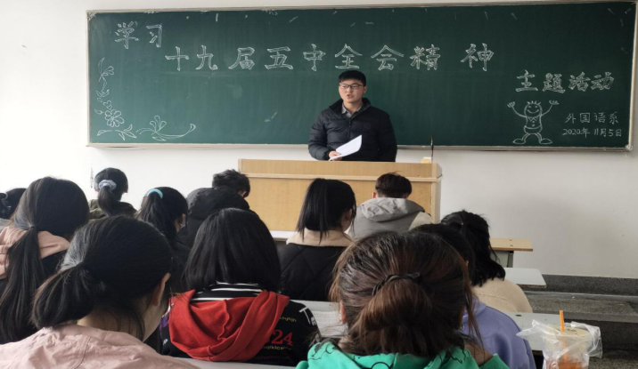 古人云:“志之所趋,无远勿届,穷山距海,不能限也。志之所向,无坚不入,锐兵精甲,不能御也”。2020年10月29日,第十九届中央委员会第五次全体会议胜利闭幕。各大高校迅速发动各级团组织第一时间学习党的十九届五中全会精神。为了更好地让同学们认识、准确把握和贯彻学习党的十九届五中全会精神,加强爱国主义教育、制度自信教育,引导学生增强民族复兴重任的责任感和使命感。外国语系于2020年11月5日13点在南校区教学楼1008教室举办此次活动。