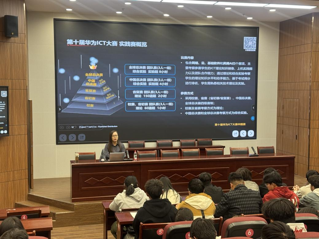宣讲会上,主持人首先对华为ICT大赛的赛事背景、发展历程、权威影响力以及往届我校学子参赛的情况进行了详细介绍。华为ICT大赛是华为公司面向全球大学生打造的ICT领域顶级竞技和交流平台,旨在推动ICT技术人才的培养、成长和就业,促进产学研深度融合。参与此类高水平竞赛,对于拓宽学生视野、检验学习成果、增强就业竞争力具有重要意义。