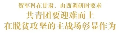 5月7日至10日,共青团中央书记处第一书记贺军科围绕学习贯彻习近平总书记五四寄语精神、在决战脱贫攻坚中更好发挥共青团作用,在甘肃临夏和山西吕梁调研,实地考察异地扶贫搬迁安置社区、现代农业示范基地、电商创业园、扶贫车间等,深入调研了解共青团助力异地搬迁扶贫、教育扶贫、产业扶贫和就业扶贫情况,与奋战在脱贫攻坚一线的青年志愿者、创业者、驻村团干部和团员青年座谈交流。