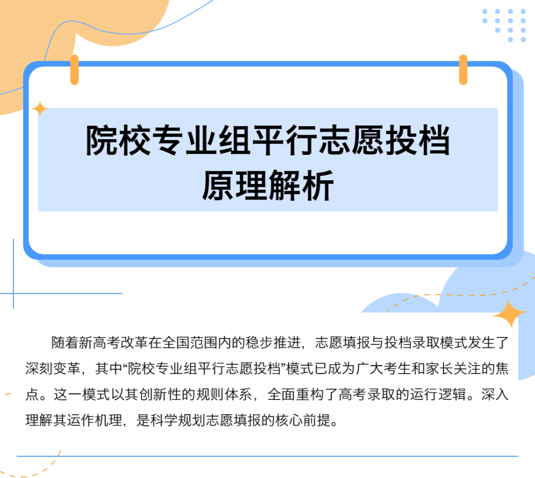 与传统志愿模式相比,院校专业组平行志愿投档模式大幅降低了考生志愿填报的风险。在传统梯度志愿模式下,考生若第一志愿填报失误未被投档,即使成绩优异,后续志愿也可能因院校在第一志愿已完成招生计划而无法投档,导致录取结果不理想。而在院校专业组平行志愿模式下,考生可填报多达45个平行的院校专业组志愿,即便第一个院校专业组志愿未被录取,仍有机会被后续院校专业组志愿投档录取,显著增加了考生的录取机会,大幅减少了因志愿填报不合理而落榜的可能性。