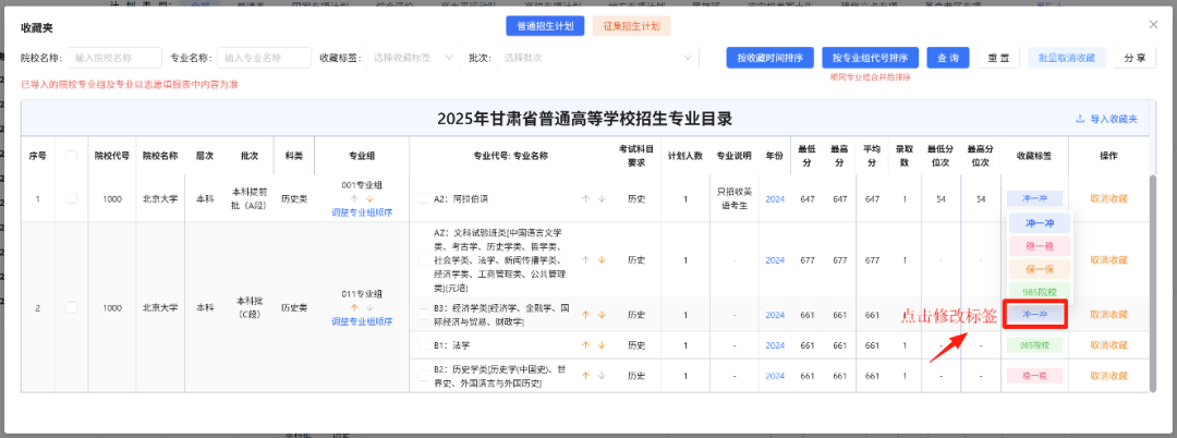 点击右侧“浏览收藏夹”按钮查看已收藏的专业内容。若考生需要修改已收藏专业的标签,可以通过点击该专业的收藏标签进行切换。