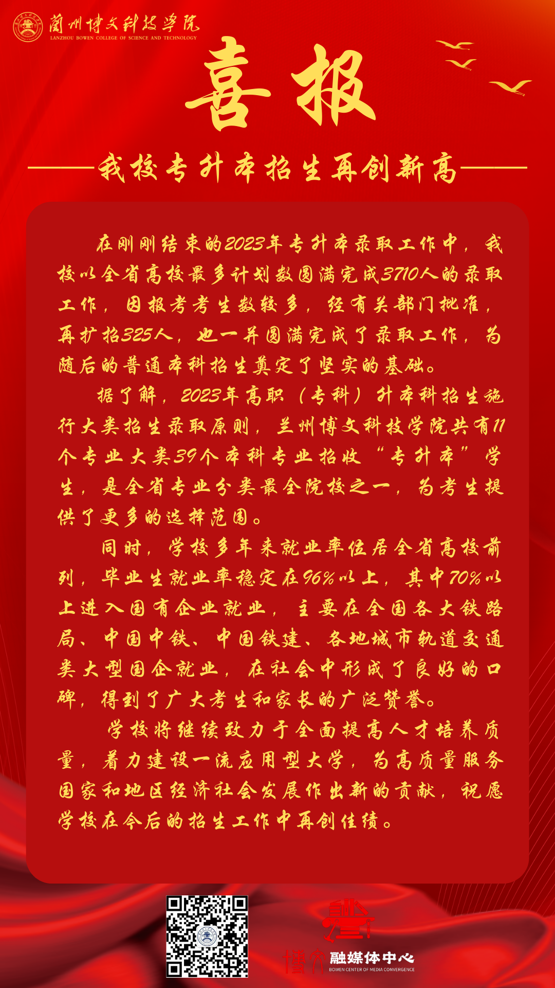 6月6日,bat365正版唯一官网2023年专升本录取工作圆满收官。目前,学校已经完成了4035份录取通知书的全部印发工作。
